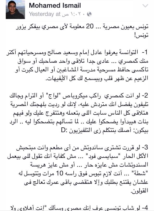 ونشر “إسماعيل” الـ20 معلومة عن تونس عبر صفحته الرسمية على موقع التواصل الاجتماعي “فيس بوك”، من خلال قالب كوميدي؛ حيث حاز المنشور إعجاب الكثيرين من رواد مواقع التواصل الاجتماعي، والتي وصلت حتى الآن إلى نحو 24 ألف إعجاب بالمنشور، وأكثر من 10 آلاف مشاركة له.