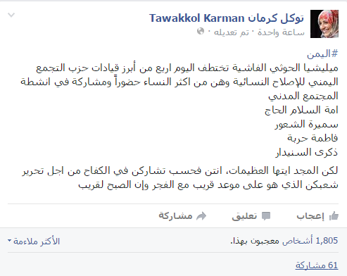 استنكرت الناشطة اليمنية توكل كرمان، اختطاف أربع قيادات نسائية بحزب التجمع اليمني للإصلاح النسائية من قبل ميليشيا الحوث، وهن “أمة السلام الحاج، وسميرة الشعور، وفاطمة حربة، وذكرى السنيدار”، مضيفة “لكنّ المجد أيتها العظيمات، أنتن فحسب تشاركن في الكفاح من أجل تحرير شعبكن الذي هو على موعد قريب مع الفجر وإن الصبح لقريب”.
