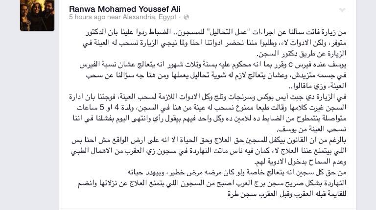 وقالت “رنوة” في منشورها: “من زيارة فاتت سألنا عن إجراءات “عمل التحاليل” للمسجون.. الضباط ردوا علينا بأن الدكتور متوفر، ولكن الأدوات لاء، وطلبوا مننا نحضر أدواتنا احنا ولما نيجي الزيارة نسحب له العينة في الزيارة عن طريق دكتور السجن”.