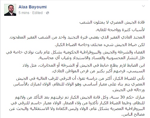 وكتب بيومي منشورا عبر صفحته الرسمية على موقع “فيس بوك” قال فيه: “قادة الجيش المصري لا يمثلون الشعب لأسباب كثيرة وواضحة للغايه، فالمجند العادي الفقير الذي يقضي فترة التجنيد واحد من الشعب الفقير المطحون، لكن ضباط الجيش شيء مختلف وخاصة الضباط الكبار”.