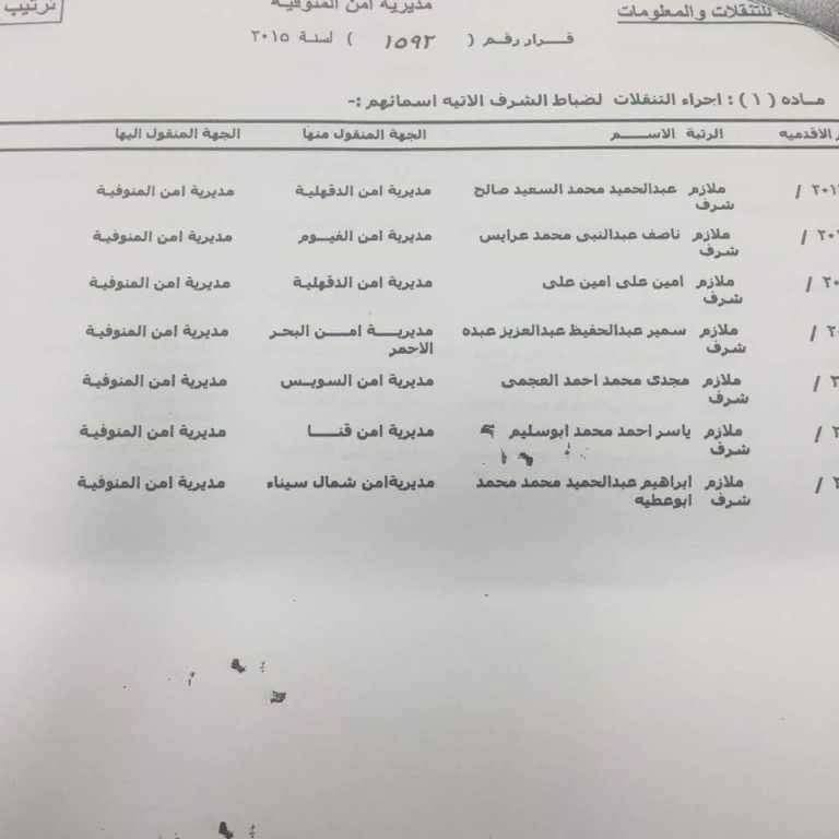 وشملت الحركة أيضًا، نقل المقدم حاتم الدهشان، رئيس مباحث قويسنا، إلى جهاز الأمن العام، والرائد مروان خميس، وكيل تنفيذ الأحكام بالمديرية، إلى إدارة جهاز الأمن العام.