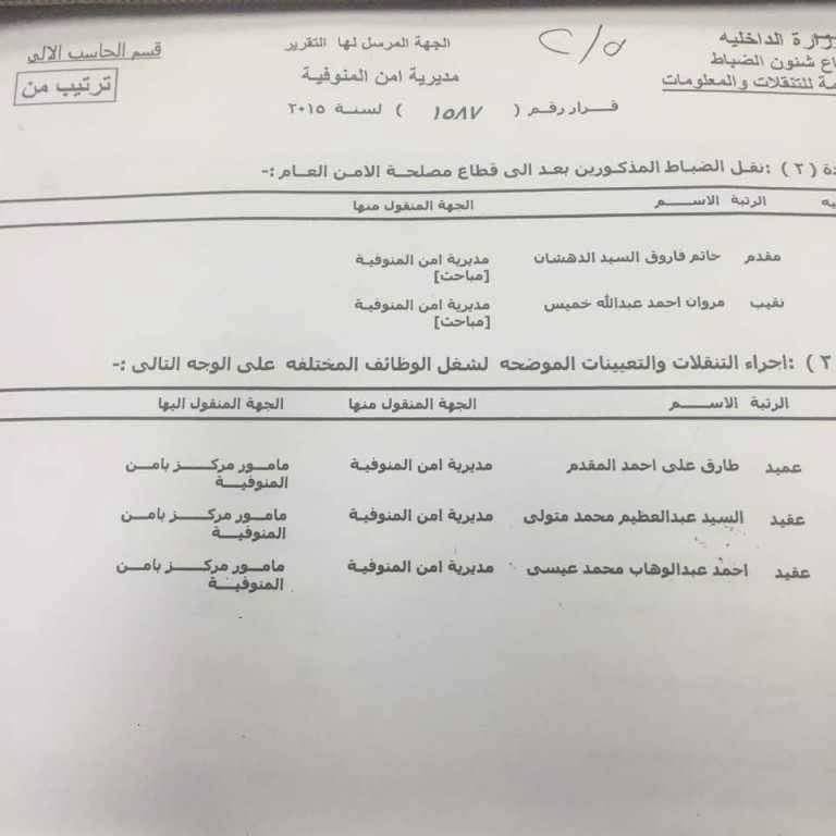 قامت وزارة الداخلية، بحركة تنقلات شملت 65 ضابطًا من وإلى محافظة المنوفية.