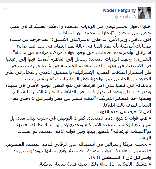 وأضاف -عبر منشور له- “ما ذكرته صحيفة “الشروق” أن الولايات المتحدة وجهت رسائل إلى القاهرة ألمحت فيها إلى رغبتها في الاستغناء عن وجود القوات متعددة الجنسية في شبه جزيرة سيناء في ظل استقرار العلاقات المصرية الإسرائيلية والتنسيق الأمني والمخابراتي على الحدود بين الجانبين في مواجهة خطر التنظيمات التكفيرية في سيناء.