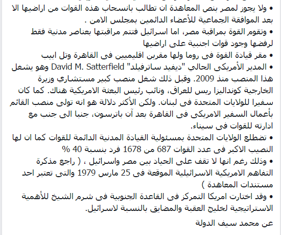 وأشار “فرجاني” إلى أن الولايات المتحدة تضطلع بمسؤولية القيادة المدنية الدائمة للقوات، كما أن لها النصيب الأكبر في عدد القوات 687 من 1678 فردًا بنسبة 40 %، وذلك رغم أنها لا تقف على الحياد بين مصر وإسرائيل، (راجع مذكرة التفاهم الأميركية والإسرائيلية الموقعة في 25 مارس 1979 والتي تعتبر إحدى مستندات المعاهدة).