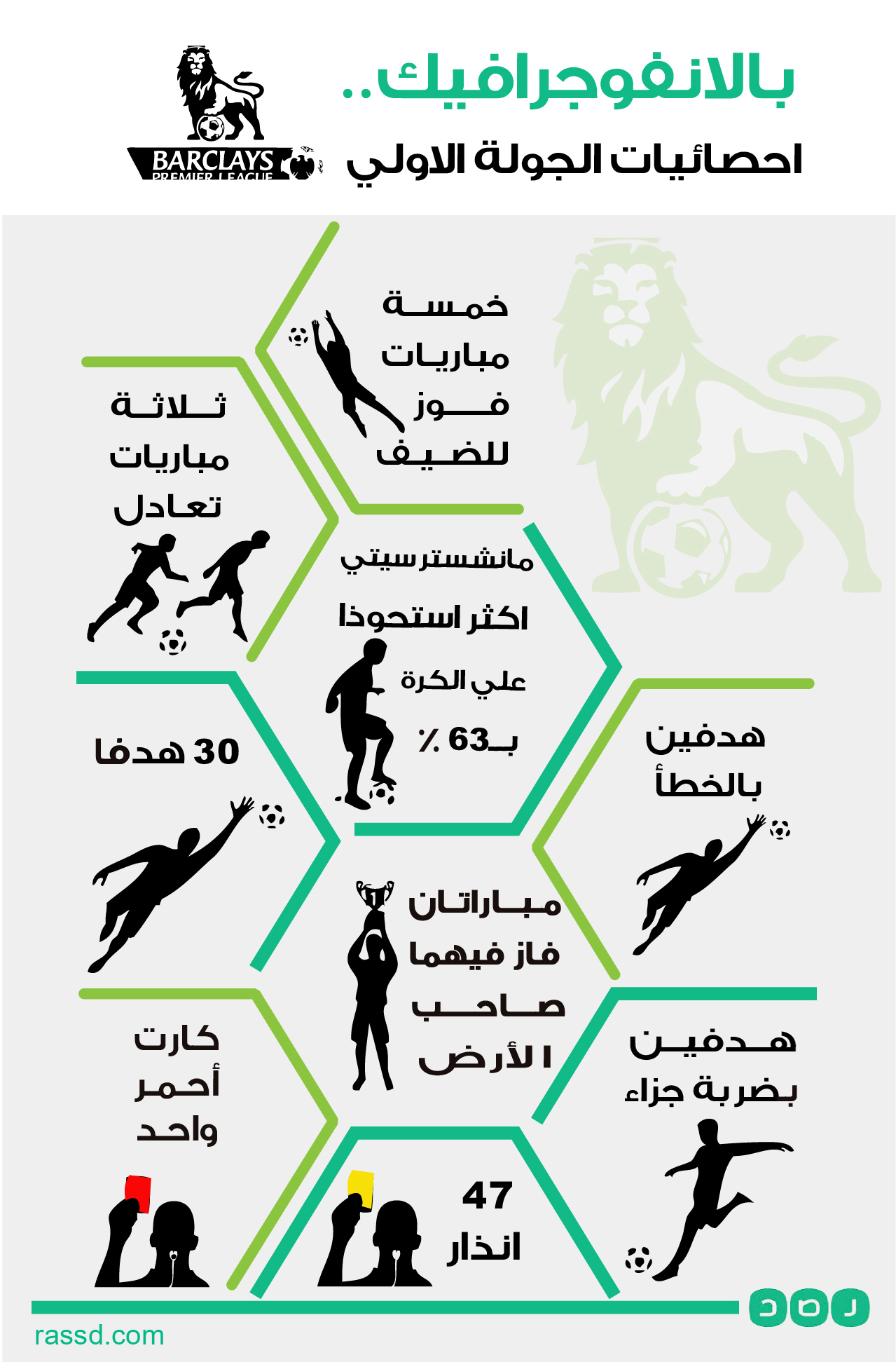 مع انتهاء الجولة الأولى من الدوري الإنجليزي (البريميرليج)، تقدم لكم “رصد” إحصائية الجولة عبر الانفوجرافيك التالي: