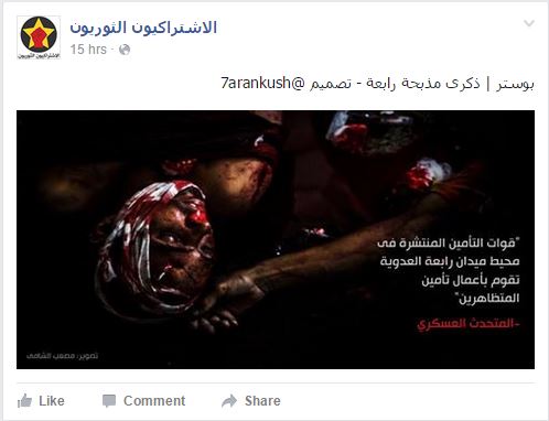 مع ذكرى مذبحة فض اعتصاميْ ميدانيْ "رابعة العدوية" و"النهضة"، نشرت صفحة "الاشتراكيين الثوريين"، "بوستر" للتعبير عن إجرام النظام في هذه المذبحة، وعلقت قائلة "الذكرى الثانية لمذبحة فض اعتصام رابعة 14 أغسطس 2013".