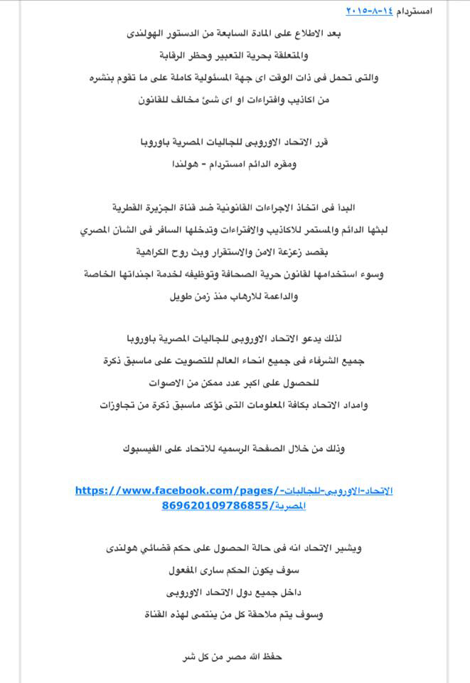كما قام الاتحاد اليوم الخميس، بإرسال البيان الثاني لعناوين البريد الإلكترونية نفسها، بينهم عنوان البريد الإلكتروني للطالب الجامعي، مطالباً بالتصويت على القرار الذي اتخذه الاتحاد للبدء في اتخاذ الإجراءات القانونية ضد قناة الجزيرة الإخبارية، معللا أن القناة تستمر في بث الأكاذيب والافتراءات في الشأن المصري، وسوء استخدامها لقانون حرية الصحافة. ويشير الاتحاد في بيانه إلى أنه في حالة الحصول على حكم قضائي هولندي، سيكون الحكم ساريا داخل جميع دول الاتحاد الأوروبي.