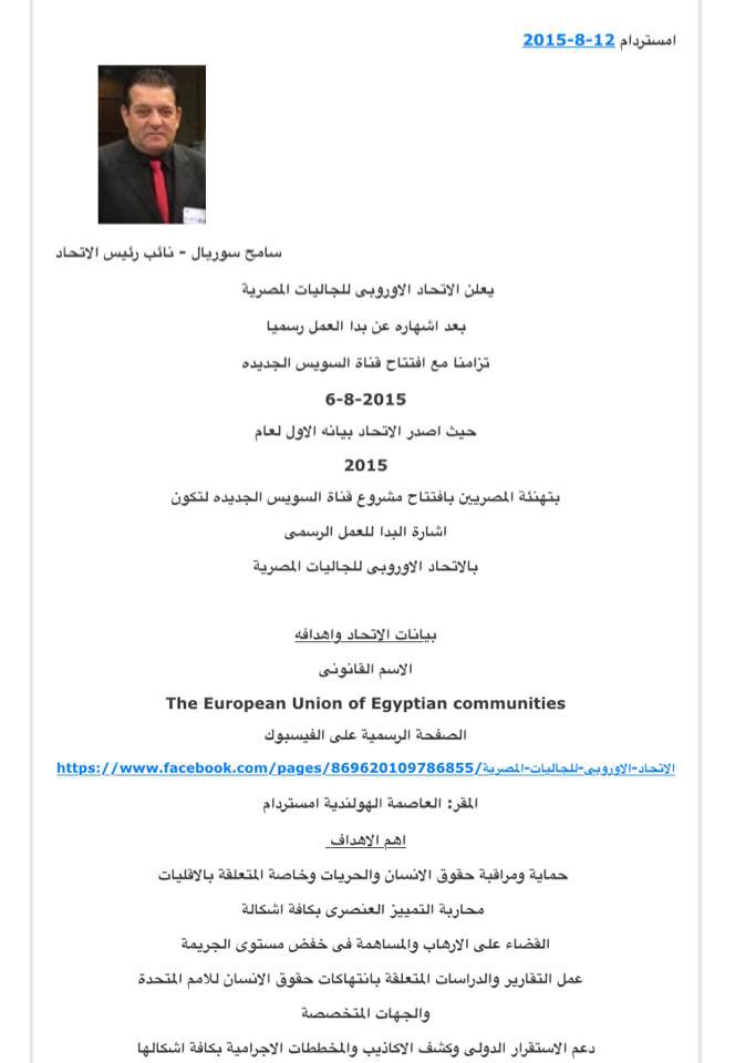 ويقول أحد أعضاء الجالية المصرية، وهو طالب جامعي يدرس بهولندا، وكان دائما يستقبل تهاني بالمناسبات على عنوان بريده الإلكتروني الخاص بالجامعة، من الهيئة القبطية الهولندية، إنه تفاجأ بعنوان بريد إلكتروني يسمى عصام عبيد، يراسله للترويج “للاتحاد الأوروبي للجالية المصرية“.