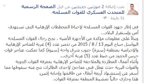 وأوضح أنه أثناء أعمال المطاردة والملاحقة للعناصر الإجرامية بمعرفة القوات الجوية والقوات البرية، حدث عطل فنى مفاجئ لإحدى الطائرات نتج عنه سقوطها مما أسفر عن مقتل أربعة أفراد طاقمها وإصابة إثنين، هذا وجار حالياً تمشيط المنطقة بمعرفة القوات، بحسب البيان.