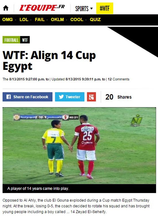 الصحيفة الفرنسية عبرت عن دهشتها الشديدة من جمال السعيد، مدرب الجونة، الذي قرر إشراك اللاعب زياد الصحيفي البالغ 14 عاما فقط، في المباراة، في الوقت الذي كان فيه الأهلي متقدما بخمسة أهداف نظيفة.