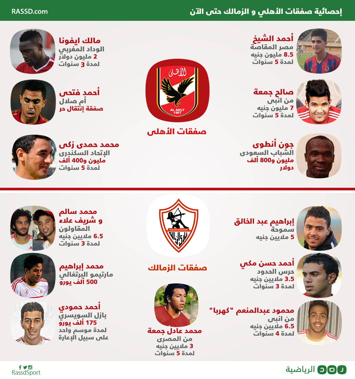 نقدم لكم إحصائية من موقع “رصد” بمجموع عدد سنوات ومبالغ صفقات فريقي الأهلي والزمالك التي أجريت خلال فترة الانتقالات الحالية.