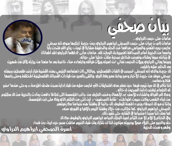 ووجهت الأسرة -خلال بيانها- تساؤلاً لـ”نقابة الصحفيين”: “أين أنتِ من الظلم الذي يقع على ابن المؤسسة؟”، ودعت الأسرة كل أصدقاء وزملاء المهنة للوقوف إلى جانبهم في وقفتهم هذه تضامنًا مع زميلهم الصحفي إبراهيم الدراوي.