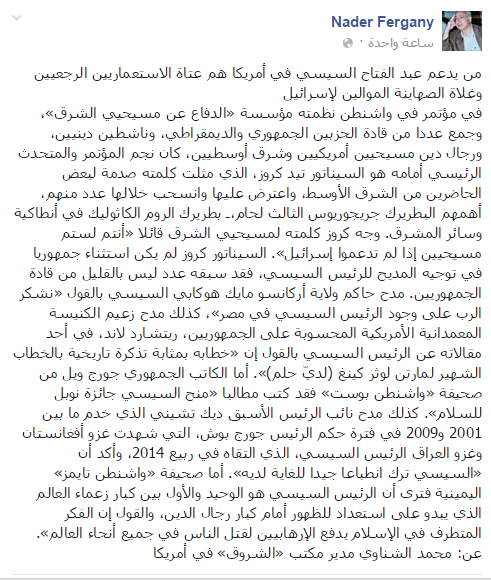 وأشار -عبر منشور له على “فيس بوك”- إلى أن السيناتور تيد كروز- والمادح دائمًا للسيسي- تحدث في مؤتمر في واشنطن نظمته مؤسسة “الدفاع عن مسيحيي الشرق”، ووجه كلمته لمسيحيي الشرق قائلًا: “أنتم لستم مسيحيين إذا لم تدعموا إسرائيل”.