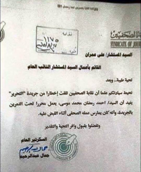 وقدم المحامون خطابات من نقابة الصحفيين، إلى النيابة العامة، تفيد أن الصحفي الذي تم تسلميه لقوات الأمن من جريدة التحرير، يعمل محررًا تحت التمرين بالجريدة، وأنه كان يمارس عمله الصحفي أثناء القبض عليه، خلال جلسة محاكمة مرسي في قضية “التخابر مع قطر”.