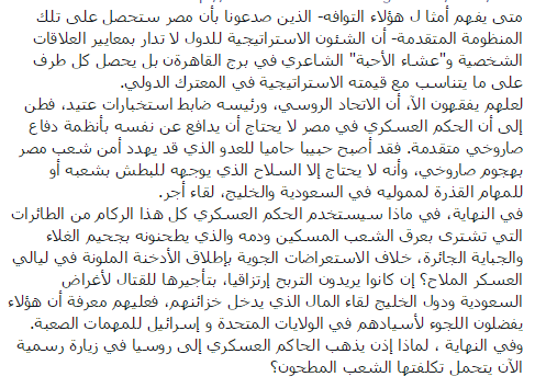 وتابع قائلا: “لعلهم يفقهون الآن، أن الاتحاد الروسي، ورئيسه ضابط استخبارات عتيد، فطن إلى أن الحكم العسكري في مصر لا يحتاج أن يدافع عن نفسه بأنظمة دفاع صاروخي متقدمة” فقد أصبح حبيبا حاميا للعدو الذي قد يهدد أمن شعب مصر بهجوم صاروخي، وأنه لا يحتاج إلا السلاح الذي يوجهه للبطش بشعبه أو للمهام القذرة لمموليه في السعودية والخليج، لقاء أجر”.