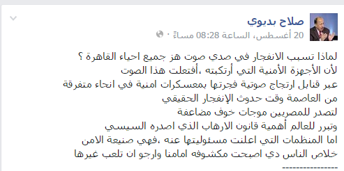 وقال الصحفي صلاح بديوي: ” لماذا تسبب الانفجار في صدى صوت هز جميع أحياء القاهرة؟ لأن الأجهزة الأمنية التي ارتكبته افتعلت هذا الصوت عبر قنابل ارتجاج صوتية فجرتها بمعسكرات أمنية في أنحاء متفرقة من العاصمة وقت حدوث الانفجار الحقيقي لتصدر للمصريين موجات خوف مضاعفة وتبرر للعالم أهمية قانون الإرهاب الذي أصدره السيسي. أما المنظمات التي أعلنت مسؤوليتها عنه فهي صنيعة الأمن.. خلاص الناس دي أصبحت مكشوفة أمامنا وأرجو أن تلعب غيرها”.