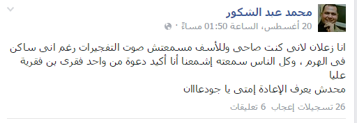 قال محمد عبد الشكور الصحفي بجريدة “الأحرار”: “أنا زعلان لأنى كنت صاحى وللأسف مسمعتش صوت التفجيرات رغم انى ساكن فى الهرم ، وكل الناس سمعته إشمعنا أنا أكيد دعوة من واحد فقرى بن فقرية عليا ..محدش يعرف الإعادة إمتى يا جودعااان”.