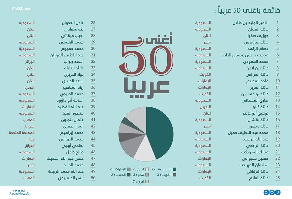 احتل السعوديون المراكز الأولى ضمن قائمة بأسماء أغنى 50 عربيًّا؛ حيث احتلوا 22 مركزًا، تلتها الإمارات بـ7 أغنياء، ثم لبنان بـ7 أثرياء، ثم مصر بـ3، بحسب موقع “دولية”.