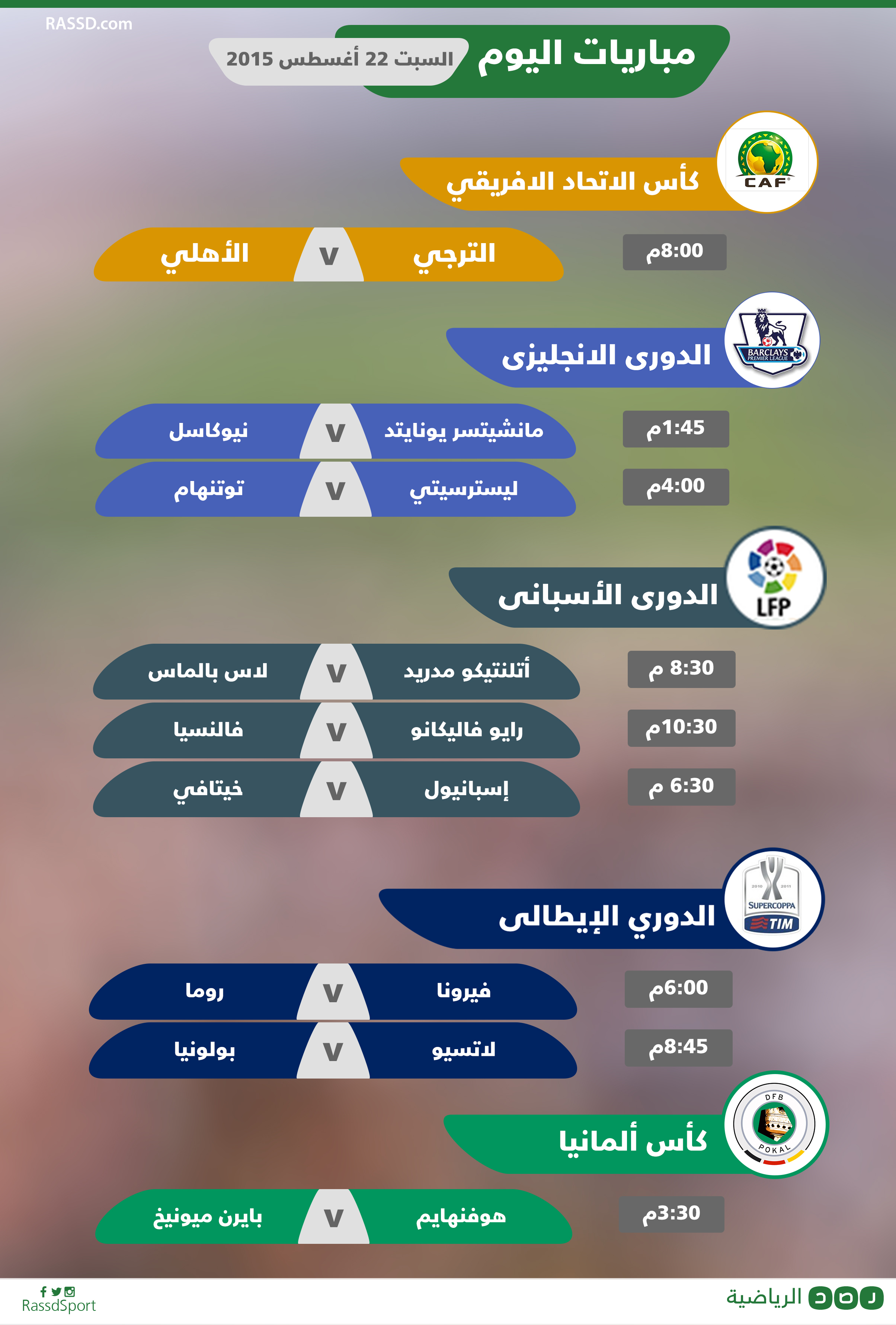 تُجرَى اليوم عدة مباريات مهمة على الصعيدين الإفريقي والدولي، تعرض “رصد” لكم جدول مباريات اليوم في الجدول التالي: