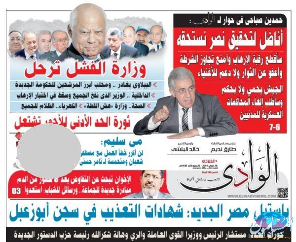 وصودر العدد اليومي من جريد الصباح، اليوم، بعد نشر مقال ينتقد عن محمد بدران، رئيس حزب مصر المستقبل، والوحيد من رؤساء الأحزاب الذي رافق عبدالفتاح السيسي، أثناء افتتاح تفريعة قناة السويس الجديدة.