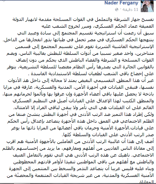 وتابع: “سبق أن زعمت أن إستراتيجية تقسيم المجتمع إلى سادة وعبيد التي ينتهجها الحكم العسكري في مصر تحمل في طياتها بذور انفجارها من الداخل، أن الإستراتيجية الفاشية الشريرة تقوم على تقسيم المجتمع إلى قسمين متناحرين، واحد صغير نسبيًا من أدوات السلطة للبطش بغالبية الناس، ويضم القوات المسلحة والشرطة والقضاء الباطش الذي يحكم من دون إنصاف بالقوانين الجائرة التي يصدرها رأس النظام مغتصبًا للسلطة التشريعية، يتوفر على إخضاع باقي الشعب لطغيان لسلطة الاستبدادية الفاسدة”.