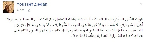وكتب “زيدان” منشورًا عبر صفحته الرسمية على موقع “فيس بوك”؛ قال فيه: “قوات الأمن المركزي، البائسة، ليست مؤهلة للتعامل مع الاعتصام المسلح بمديرية أمن الشرقية، لا هي ولا غيرها من القوى الشُّرطية.. لا بد من تدخل فوري للجيش، يبدأ بإخلاء محيط المديرية ومحاصرتها بإحكام، وإظهار الحزم التام في معالجة هذه الشرارة المنذرة بمأساة فادحة”.