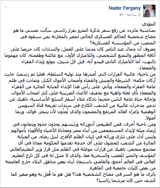 وذكر فرجاني -خلال منشور له على موقع التواصل الاجتماعي “فيس بوك”- أنه معروف أن جمال عبد الناصر كان مدمنًا على العمل، والسادات كان حريصًا على أناقة المظهر والتمتع الشخصي، واللامبارك الأول، مع عائلته وطغمته، كان مهمومًا بالنهب، أما اللامبارك الثاني فيبدو أنه قبل كل شيء مولع بإيذاء الفقراء والضعفاء”.