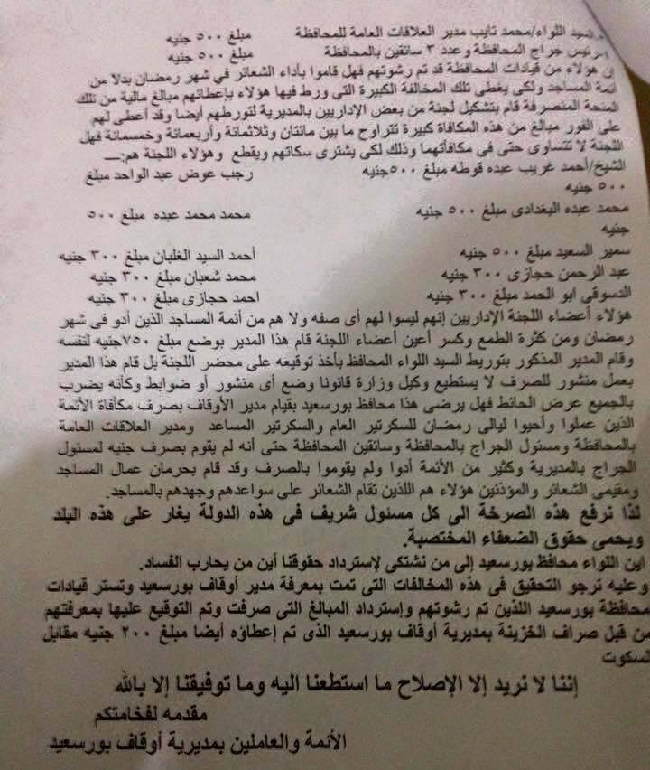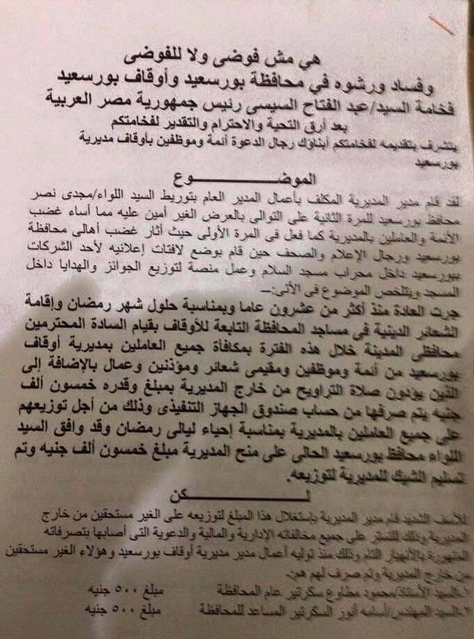 تقدم عدد من الأئمة والعاملين بمديرية أوقاف بورسعيد بشكاوى واستغاثات رفعت بعضها لعبد الفتاح السيسي، قائد الانقلاب العسكري، ووزير الأوقاف ومحافظ بورسعيد؛ يتهمون فيها قيادات المديرية بالمحافظة بالفساد والرشوة.