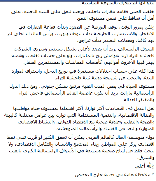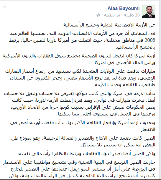 أعرب علاء بيومي الباحث والكاتب السياسي عن اعتقاده أن جزءًا من الأزمات الاقتصادية الدولية التي يعيشها العالم منذ 2008 في مناطق مختلفة -حيث انتقلت من أميركا لأوربا للصين حاليًّا- يرتبط بالجشع الرأسمالي.
