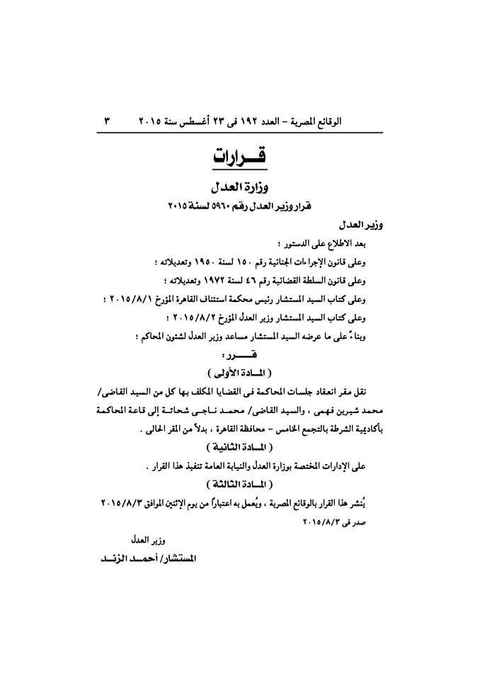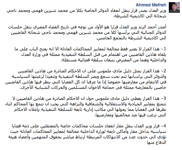 أدان الناشط الحقوقي أحمد مفرح مدير مركز الكرامة لحقوق الإنسان قرار المستشار أحمد الزند وزير العدل بحكومة محلب نقل مقر انعقاد جلسات المحاكمات في القضايا المكلف بها كل من القاضى محمد شيرين فهمى، والقاضى محمد ناجى شحاتة