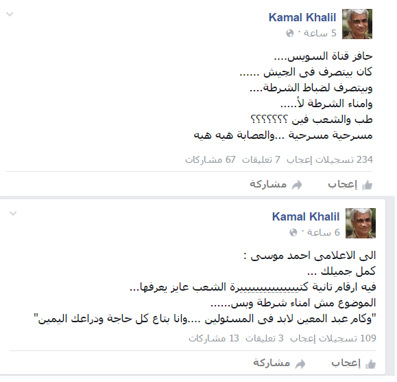وأضاف “خليل” في منشور له على صفحته الرسمية بموقع “فيس بوك” اليوم الثلاثاء: “حافز القناة كان بيتصرف في الجيش ولضباط الشرطة والأمناء لا.. طب والشعب فين؟.. مسرحيه مسرحيه والعصابه هيه هيه”.