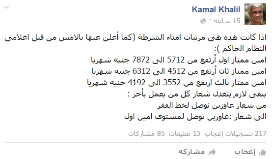 تساءل كمال خليل، الناشط العمالي، بعد إعلان مقدم البرامج التلفزيونية، أحمد موسى، المقرب من جهاز الأمن الوطني (أمن الدولة سابقًا) عن مرتبات الأمناء: طيب مرتبات الضباط واللواءات تبقى كام؟ معلقًا: “مسرحية والعصابة هيه هيه”.