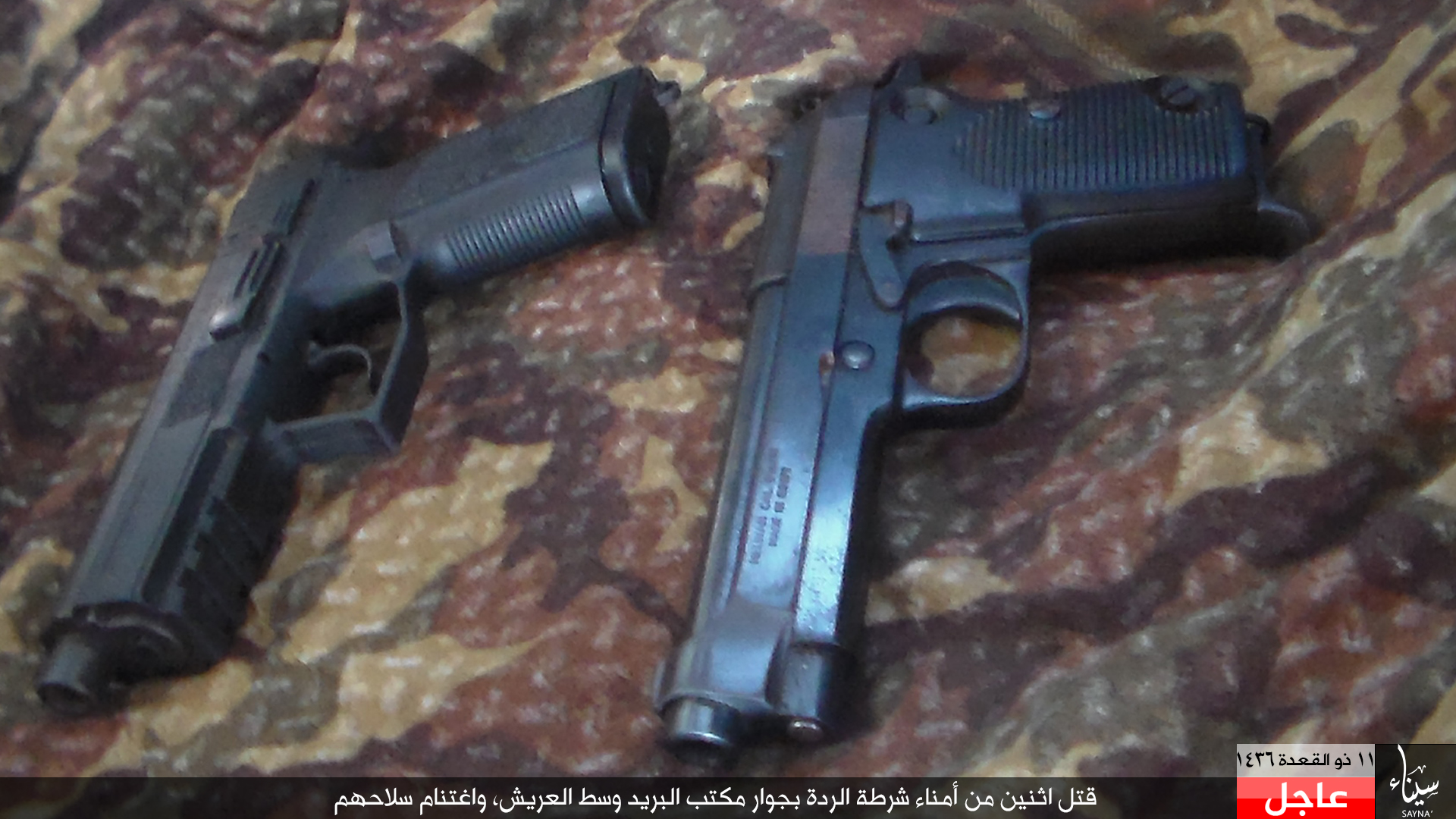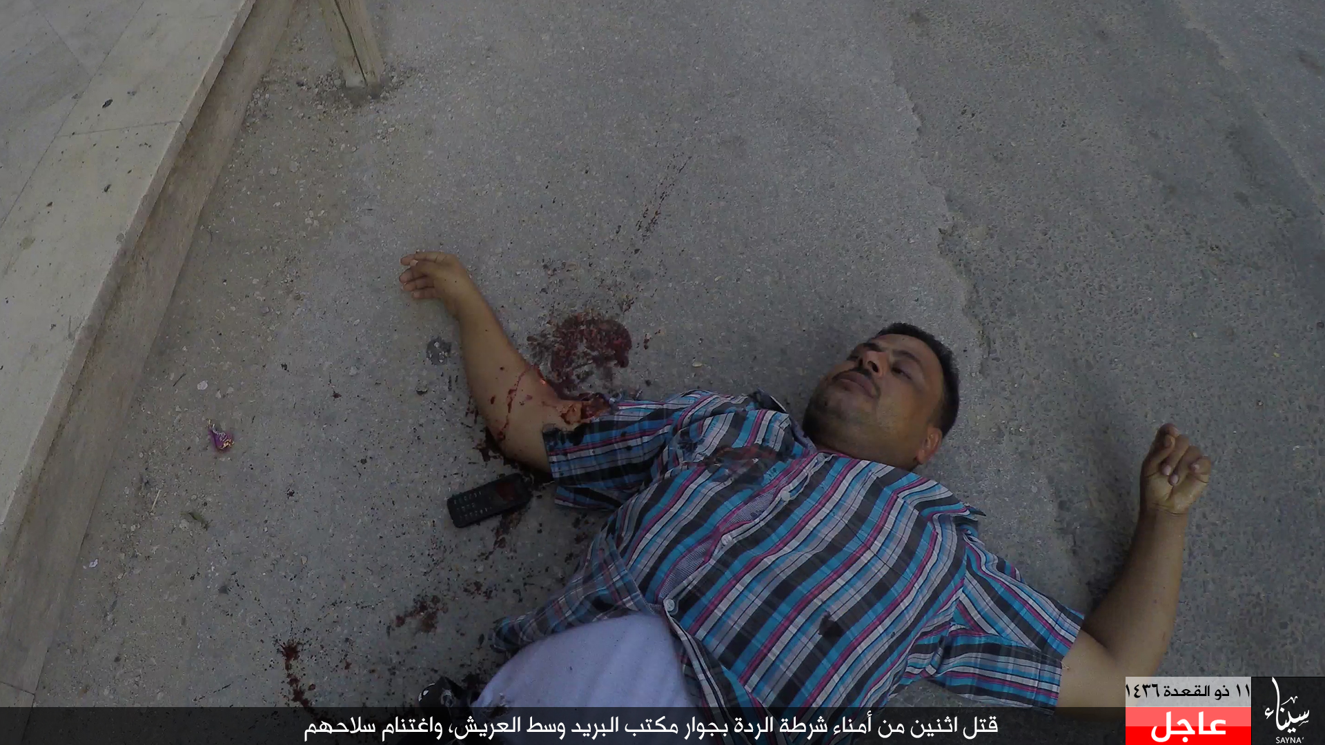 ونشر تنظيم “ولاية سيناء”، صورًا توضح مقتل الشرطيين، والحصول علي أسلحتهما.