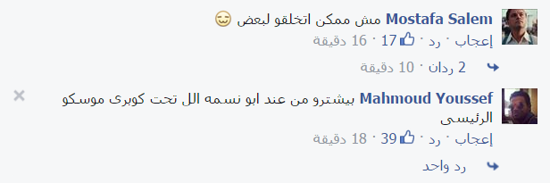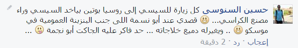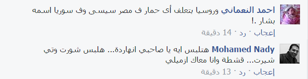 وعلق أحمد النعماني: “روسيا بتعلف أي حمار.. بمصر السيسى وفي سوريا اسمه بشار .!”، بينما قال محمد نادي ساخرًا على أن السيسي يتبع بوتين في أي شيء ويقلده كالأعمى قائلاً: “هتلبس ايه يا صاحبي انهاردة… هلبس شورت وتي شيرت… قشطة وانا معاك ازميلي”.