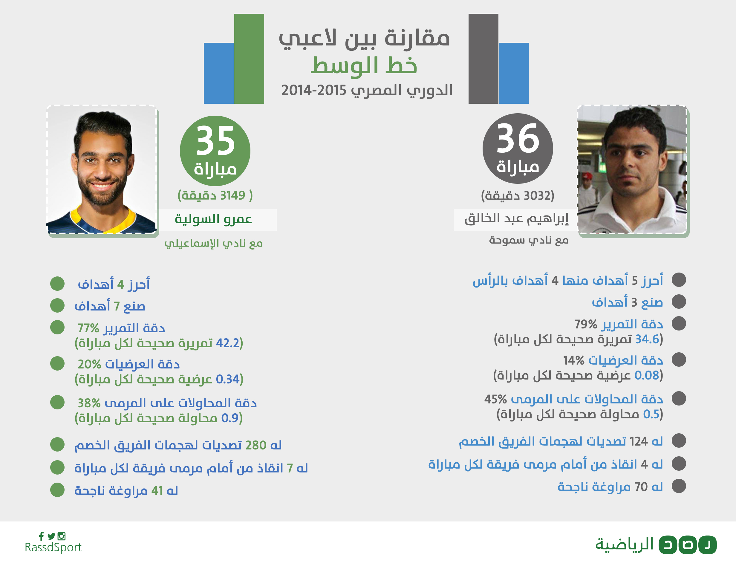يعرض موقع “رصد” مقارنة بين خط الوسط إبراهيم عبدالخالق، لاعب سموحة السابق ولاعب الزمالك الحالي، وعمرو السولية، لاعب الإسماعيلي المنتقل إلى الشعب الإماراتي، وذلك أثناء مسيرتهما مع أنديتهما السابقة في الدوري المصري بموسم 2014-2015 المنصرم، وذلك عبر الإنفوجراف التالي: