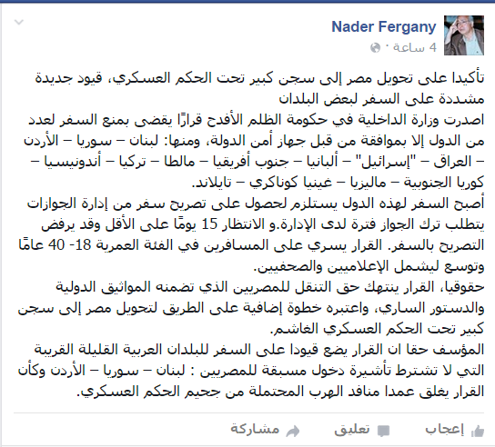 وأعرب عن أسفه بأن القرار يضع قيودًا على السفر للبلدان العربية القليلة القريبة التي لا تشترط تأشيرة دخول مسبقة للمصريين ولبنان، وسوريا، والأردن، “وكأن القرار يغلق عمدًا منافد الهرب المحتملة من جحيم الحكم العسكري.