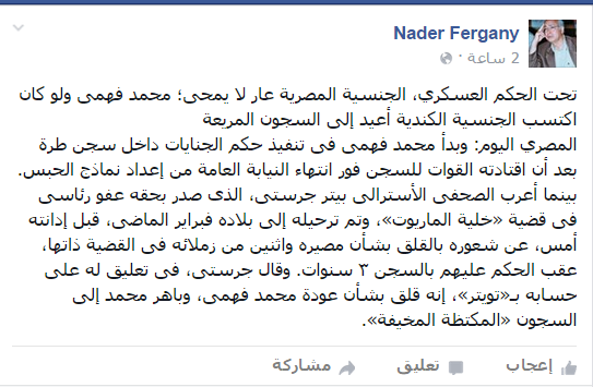 ونقل “فرجاني” -عن “المصري اليوم”، عبر منشور له على “فيس بوك”- أن محمد فهمي بدأ في تنفيذ حكم الجنايات داخل سجن طره، بينما أعرب الصحفي الأسترالي بيتر جرستي، الذي صدر بحقه عفو رئاسي، وتم ترحيله إلى بلاده فبراير الماضي، قبل إدانته أمس، عن شعوره بالقلق بشأن مصيره واثنين من زملائه في القضية ذاتها، عقب الحكم عليهم بالسجن 3 سنوات.