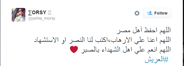 ودعا yehia morsy بأن يحفظ الله أهل مصر، ويعينها على الإرهاب، ويكتب لهم النصر أو الاستشهاد، وينعم على أهل الشهداء بالصبر”.