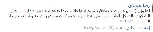 وقال -عبر منشور له على “فيس بوك”-: “لما وزير (التربية) يتوعد بمعاقبة مريم لأنها طالبت بما تعتقد أنه حقها، ومارست حق الشكوى بالشكل القانوني، يبقى هذا الوزير لا يعرف شيئًا عن التربية ولا التعليم ولا القانون ولا العدالة”.