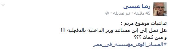 وتساءل -في منشور آخر مندهشًا-: ” تداعيات موضوع مريم: هل تصل إلى ابن مساعد وزير الداخلية بالدقهلية!!!؟”.