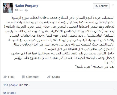 وجاء تعليق فرجاني في منشور عبر صفحته الشخصية على موقع التواصل الاجتماعي “فيس بوك” قائلاً: “استقبلت جريدة اليوم السابع تاجر السلاح محمد دحلان المكلف بتوزيع الرشوة الإماراتية على الصحف كما يستقبل رؤساء الدول ونشرت الجريدة عشرات الصحف لدحلان وهو يتصدر اجتماعا لمجلس التحرير ومن حوله رئيس تحرير الجريدة واتباعه (يخدمون) على دحلان ويلتقطون الصور التذكارية معه وينشرون تصريحاته ضد رئيس السلطة الفلسطينية”.