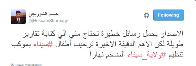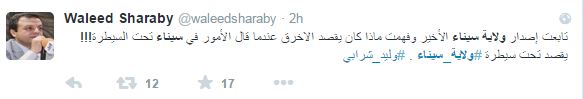 وعلق المستشار وليد شرابي، رئيس حركة “قضاة من أجل مصر”: “تابعت إصدار ولاية سيناء الأخير وفهمت ماذا كان يقصد الأخرق عندما قال الأمور في سيناء تحت السيطرة!!! يقصد تحت سيطرة #ولاية_سيناء”.