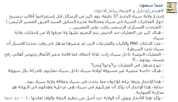 واعتبر هذا الإصدار وثيقة براءة للإخوان مما يحدث في سيناء وعلاقة ولاية سيناء بهم، كما أنه يوثق أن الولاية جزء أصيل من تنظيم الدولة والولاء لقادته، مشيرًا إلى أن هناك حاضنة شعبية غير مسبوقة لولاية سيناء داخل سيناء تمكنهم بالحركة بكل سهولة، وأن هذا الإصدار يؤكد أن معركتهم في سيناء هي مرحلية وهدفهم في النهاية هو محاربة الصهاينة.