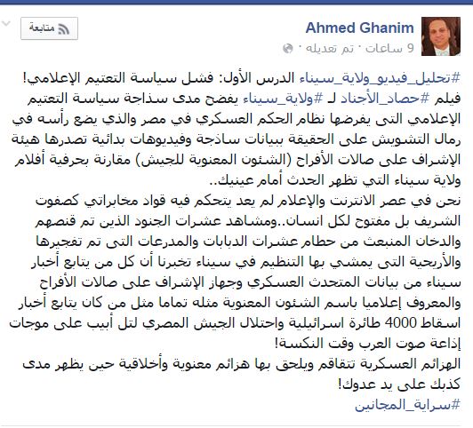 وأكد أحمد غنيم، أن فيديو ولاية سيناء، يفضح “مدى سذاجة سياسة التعتيم الإعلامي التي يفرضها نظام الحكم العسكري في مصر والذي يضع رأسه في رمال التشويش على الحقيقة ببيانات ساذجة وفيديوهات بدائية تصدرها هيئة الإشراف على صالات الأفراح (الشؤون المعنوية للجيش) مقارنة بحرفية أفلام ولاية سيناء التي تظهر الحدث أمام عينيك”.