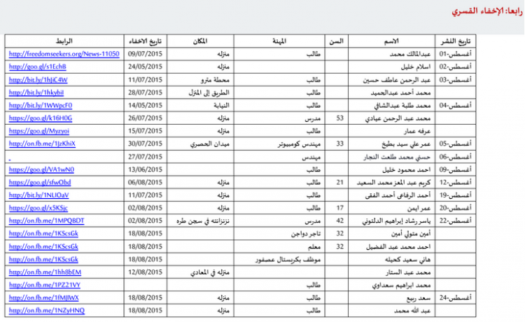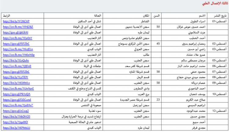 شمل التقرير 56 حالة وفاة، و57 حالة تعذيب، و44 حالة إهمال طبي، و38 حالة إخفاء قسري.