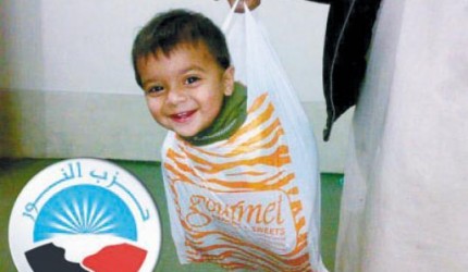 نشر شباب الحزب صورا تظهر رجلا يرتدي جلبابا دون أن تظهر ملامحه، ويحمل في يده “كيس” من البلاستيك بداخله طفل صغير يظهر منه الرأس فقط، وتعلوه ابتسامة عريضة وكتب تحت الصورة: “وطبعا الناس بتسأل في الشارع حزب النور هيوزع علينا إيه عشان ننتخبه؟ نقولهم بيوزعوا أطفال سلفيين في أكياس الحق خد لك واحد.. وشوف إنت عايزه بلحية ولا من غير.. معا على طريق النور”.