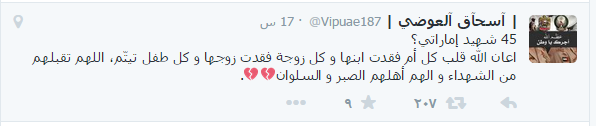 دشن نشطاء “هاشتاج” بعنوان “45 شهيد إماراتي” على موقع التواصل الاجتماعي “تويتر”، عقب مقتل 45 جنديًا إماراتيًا في مدينة مأرب اليمنية، إثر سقوط صاروخ أرض أرض على مقر إقامتهم، وأصبح “الهاشتاج” هو الأكثر تداولاً في الإمارات خلال الساعتين الماضيتين.