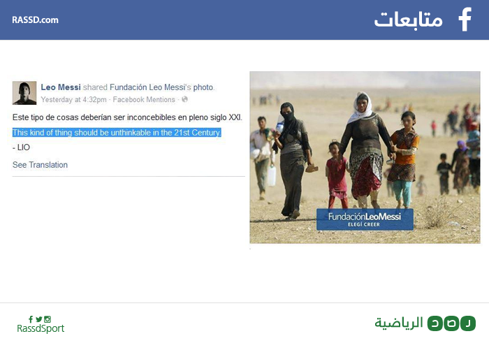 ووضع ميسي صورة للاجئين عرب في الصحراء، عبر الصفحة الرسمية لمؤسسته الخيرية، معلقًا: “مثل هذه الأشياء لا يمكن أن تحدث في القرن الحادي والعشرين”.