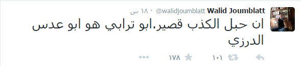 وأضافت الوكالة أن المتهم أقر بتلقيه الدعم من زعيم الحزب التقدمي الاشتراكي في لبنان النائب وليد جنبلاط؛ الذي ما لبث أن علق على خبر القبض على أبو طرابة في تغريدة على حسابه في تويتر، قائلاً: “إن حبل الكذب قصير.. أبو طرابة هو أبو عدس الدرزي”، في إشارة إلى أنه من صنع المخابرات السورية”.