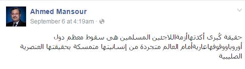 بيمنا قال الإعلامي أحمد منصور، إن “حقيقة كُبرى أكدتها أزمة اللاجئين المسلمين هي سقوط معظم دول أوروبا ووقوفها عارية أمام العالم متجردة من إنسانيتها متمسكة بحقيقتها العنصرية الصليبية”.